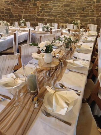 Půjčujeme univerzální potahy na židle z bílého saténu 50Kč za ks. K dispozici máme 80ks